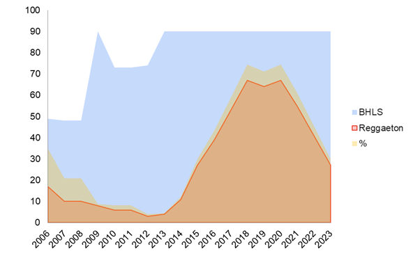 Géneros musicales en el Billboard Hot Latin Songs (BHLS) 2006-2023.